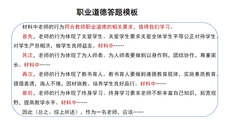 - 首先,教师的行为符合/违背了教育观的要求。教育观是XXX(9条里选2条明显的),材料中老师的XX行为对学生产生了XX影响。(材料概况抓关键行为)